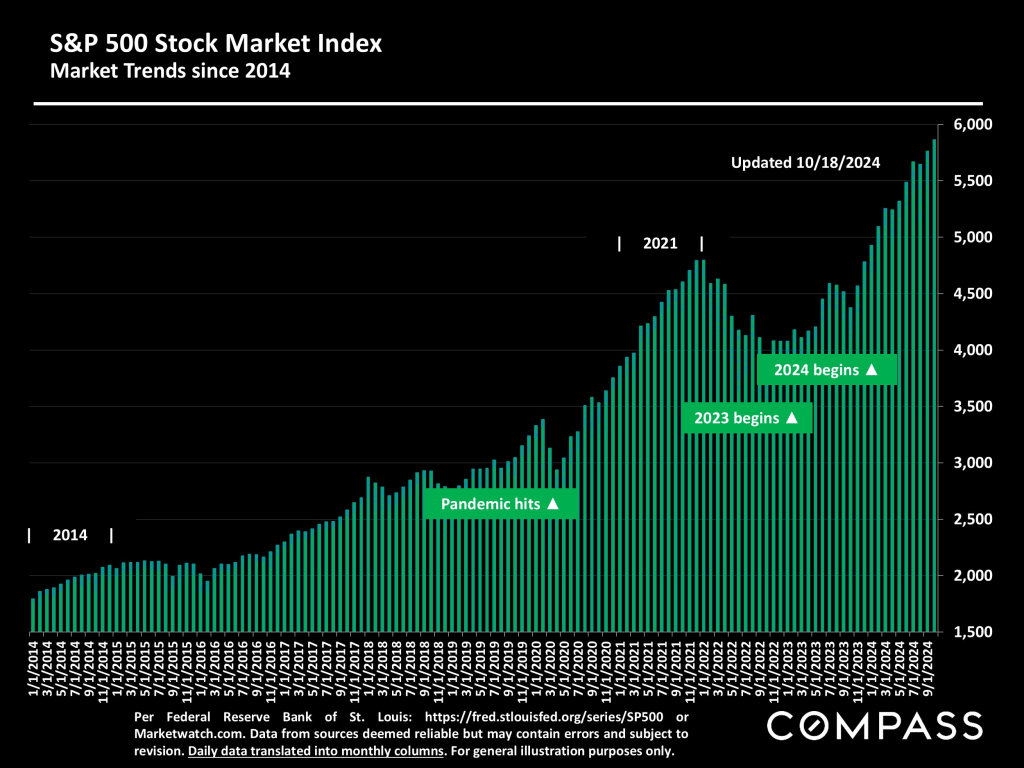 The S&P 500, illustrated below, and the Dow stock index both recently hit new all-time highs, and the Nasdaq has come very close to doing so. This deeply affects household wealth and economic confidence, especially for affluent households.