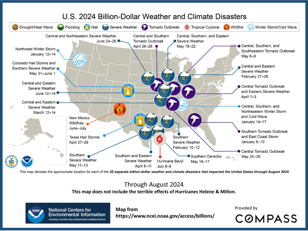 Behind the increase in insurance rates has been the increase in weather disasters, which can hit different regions in different ways in different years. This 2024 YTD map does not yet include the terrible hurricanes of recent months.