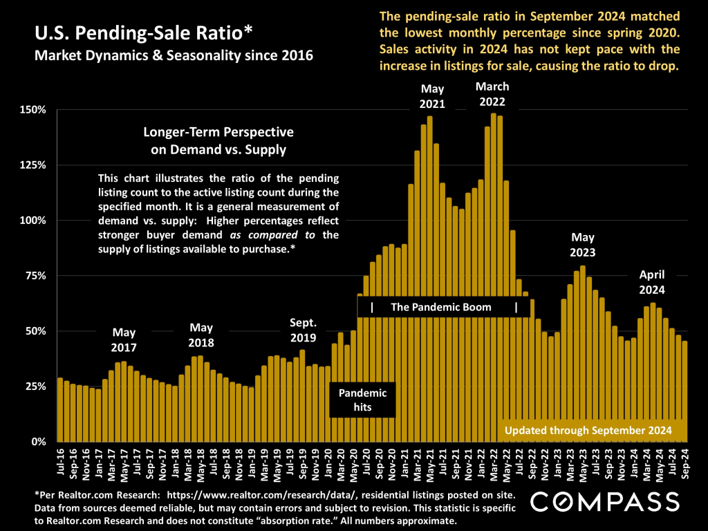 The pending-sale ratio measures demand vs. the supply of listings. The higher the ratio, the more heated and competitive the market. The changes mentioned above have caused the ratio to decline – but note that while the ratio is low compared to recent years, it is not low compared to pre-pandemic norms.